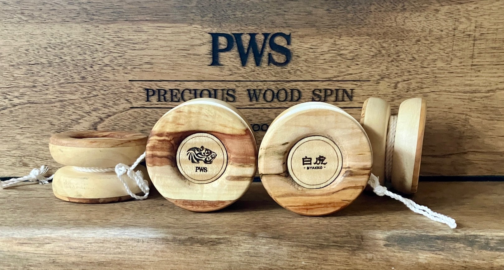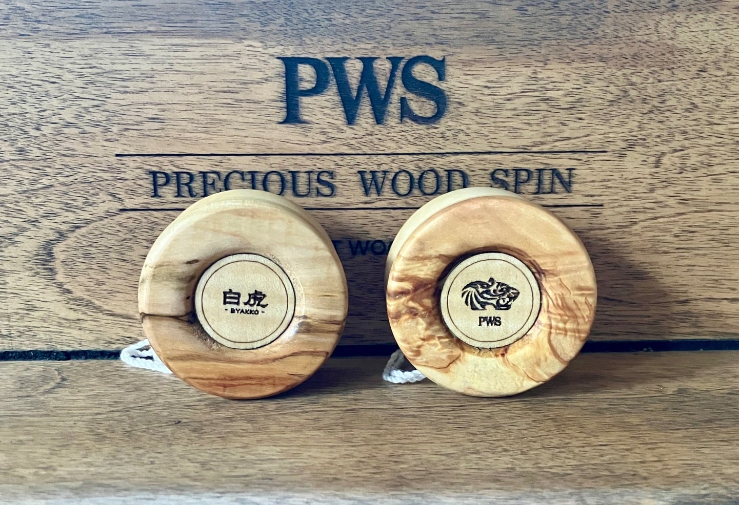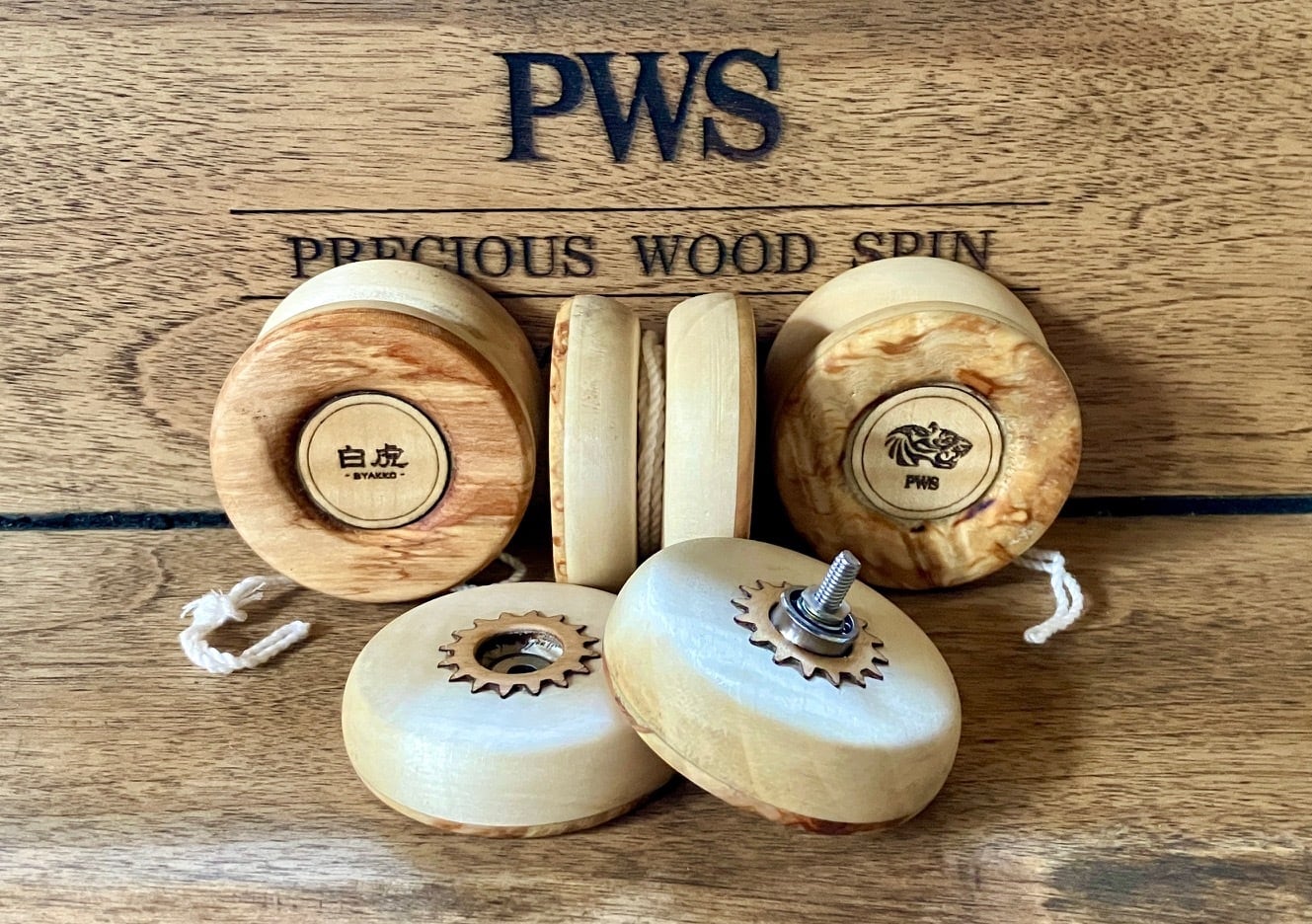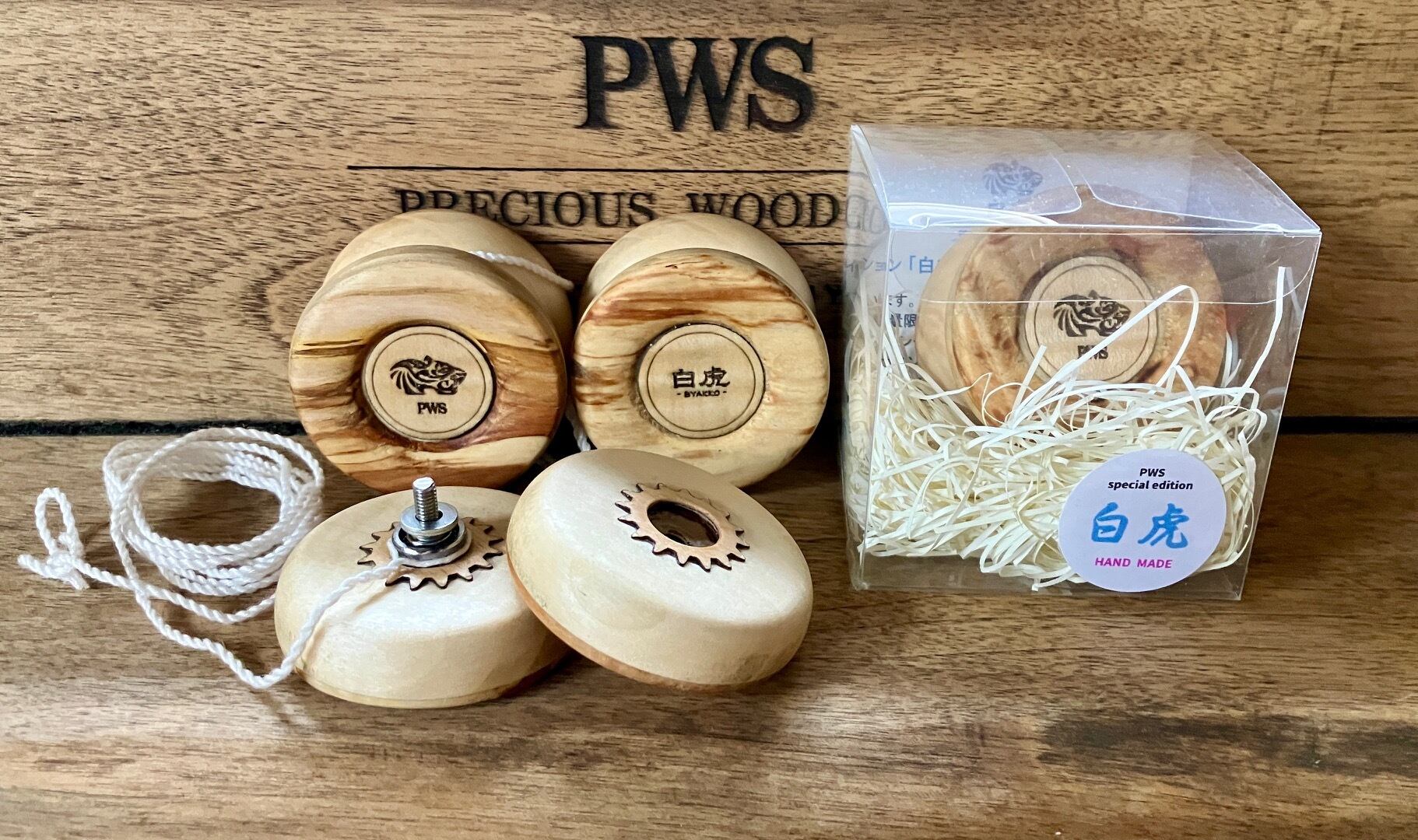 本品は銘木(PRECIOUS WOOD)と呼ばれる貴重な無垢木材を使用し、ひとつずつハンドメイドで作られた木製ヨーヨー「PWS (プレシャス ウッド スピン)」シリーズの数量限定モデルです。今回は栃の木の虎目、スポルテッド杢をフューチャーしたモデル、PWS「白虎」です。