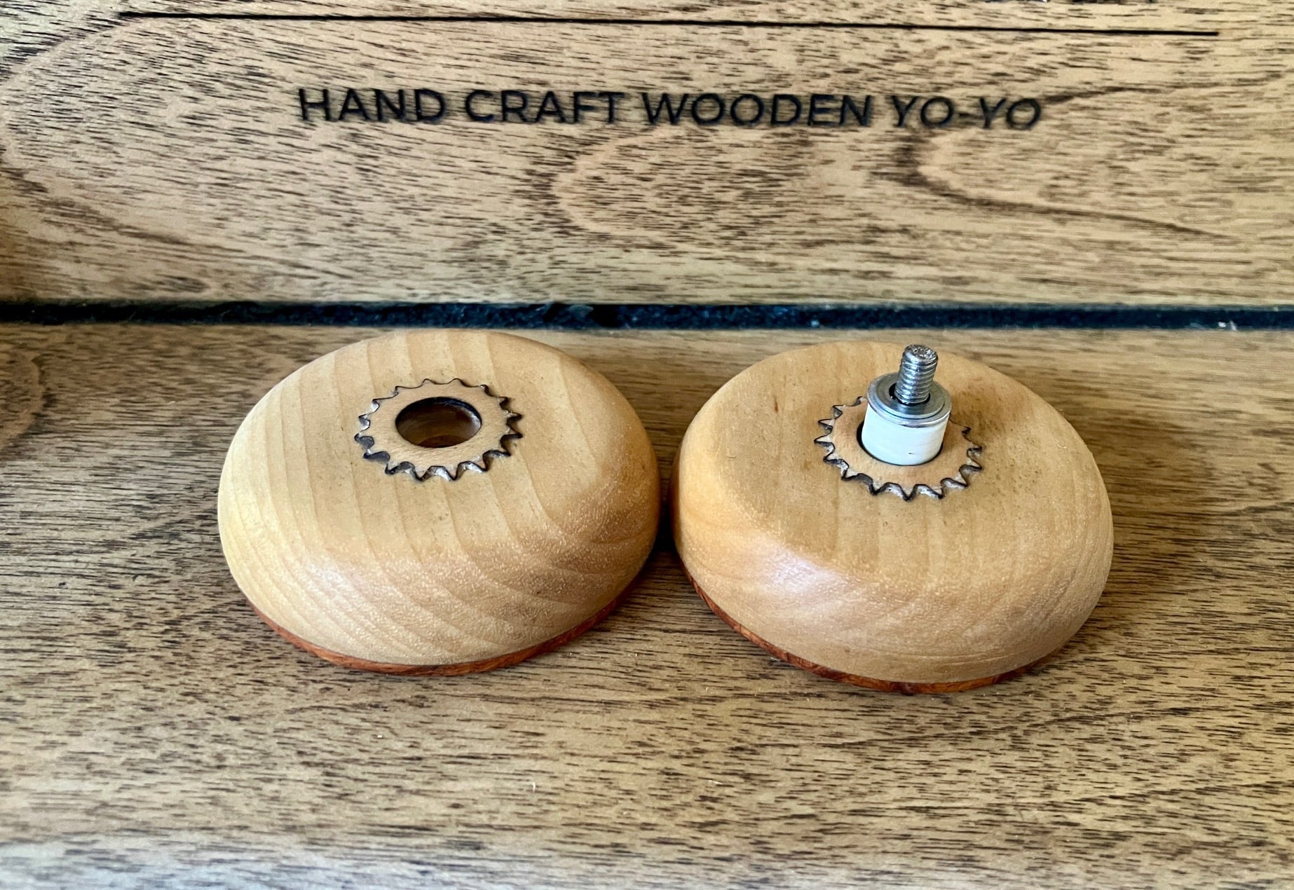 木製ヨーヨーとしては稀なプラスチックベアリングを搭載し長時間のスリープ(空回り)を可能にしました。またボディの脱着も可能で内部のメンテナンスや紐絡まり等のトラブルもボディを分離することで楽に解消できます。